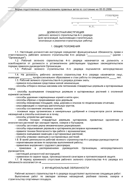 Должностная инструкция рабочего зеленого строительства 4-го разряда (для организаций, выполняющих строительные, монтажные и ремонтно-строительные работы)