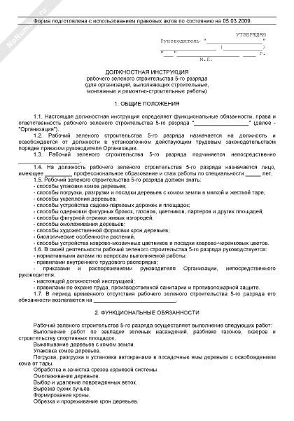 Должностная инструкция рабочего зеленого строительства 5-го разряда (для организаций, выполняющих строительные, монтажные и ремонтно-строительные работы)