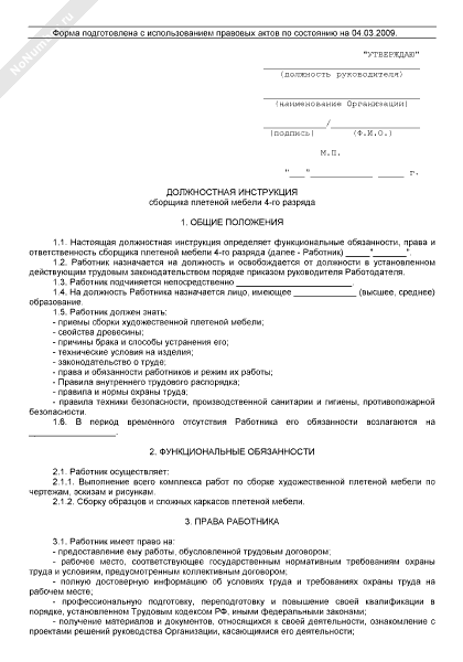 Должностная инструкция сборщика плетеной мебели 4-го разряда