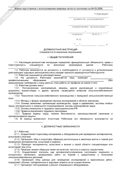 Должностная инструкция специалиста по агрономии (агрохимика)