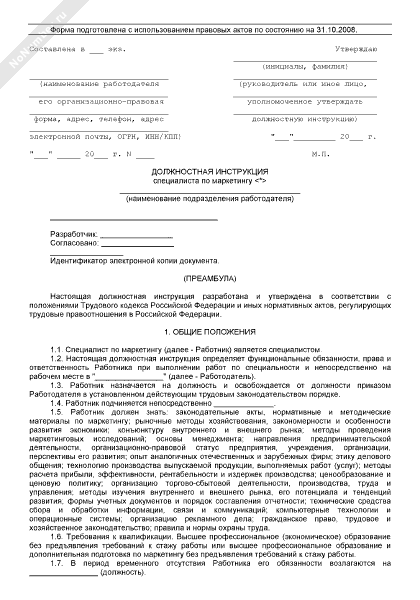 Должностная инструкция специалиста по маркетингу (рекомендуемый образец заполнения)