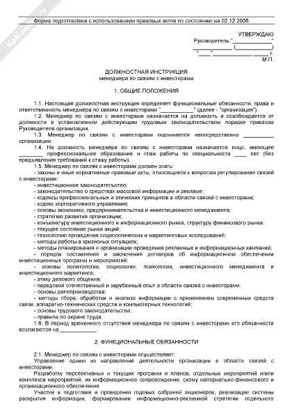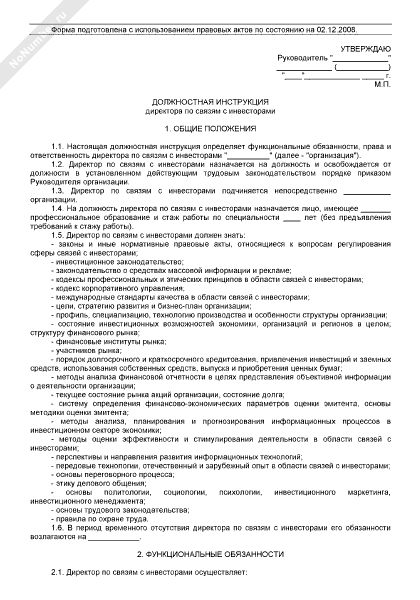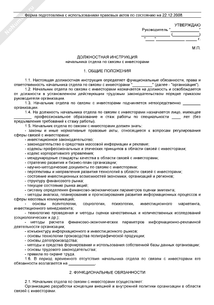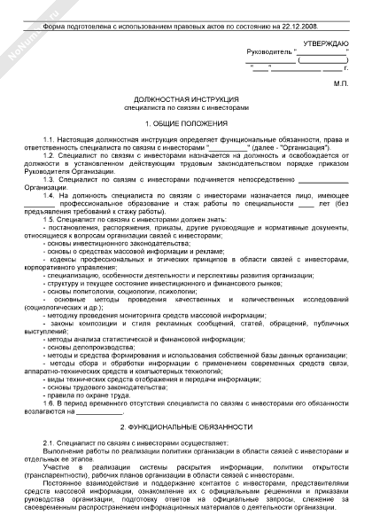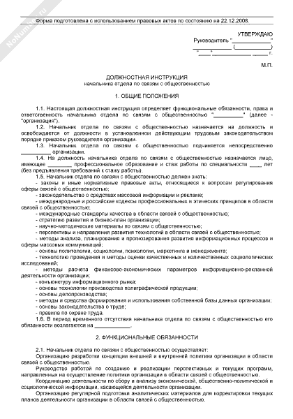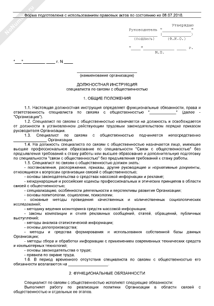 Должностная инструкция специалиста по связям с общественностью (рекомендуемый образец заполнения)