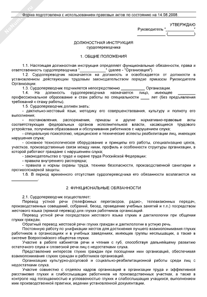Должностная инструкция сурдопереводчика (рекомендуемый образец заполнения)