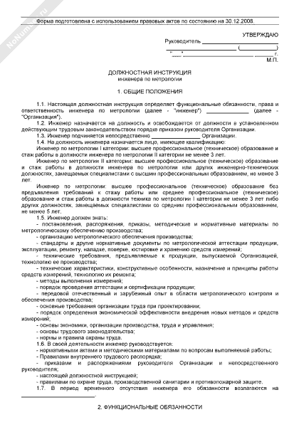 Должностная инструкция начальника (руководителя) отдела метрологии