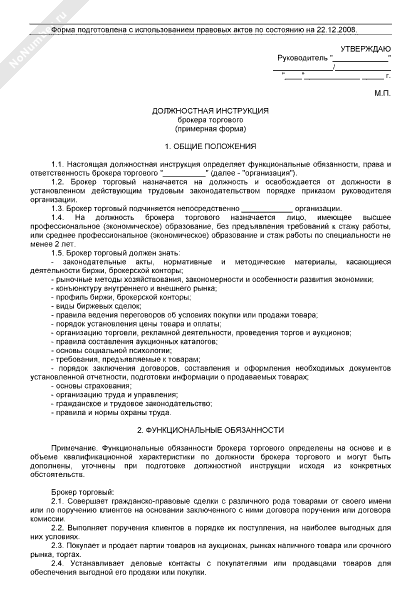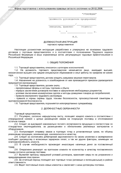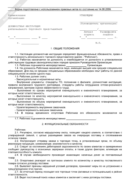 Должностная инструкция торгового представителя (рекомендуемый образец заполнения)
