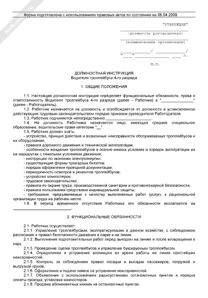 Должностная инструкция водителя троллейбуса 6-го разряда (рекомендуемый образец заполнения)