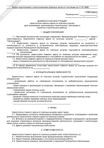 Должностная инструкция заместителя главного врача по платным услугам (для организаций, выполняющих строительные, монтажные и ремонтно-строительные работы)