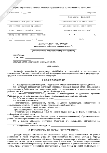 Должностная инструкция заведующего кабинетом охраны труда (рекомендуемый образец заполнения)