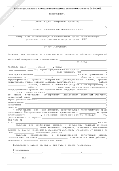 - 240Доверенность, выданная юридическим лицом для заявления отказа от права постоянного (бессрочного) пользования земельным участком (с правом осуществлять все действия, способствующие переоформлению права постоянного (бессрочного) пользования земельным участком)