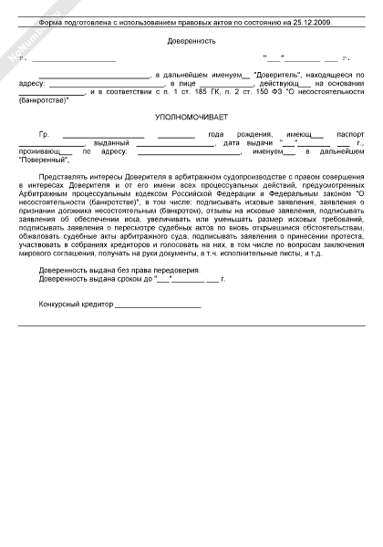 - 222Доверенность представителя конкурсного кредитора, подтверждающая полномочия на голосование по вопросу заключения мирового соглашения