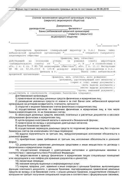 - 225Доверенность руководителю филиала кредитной организации, созданной в форме акционерного общества
