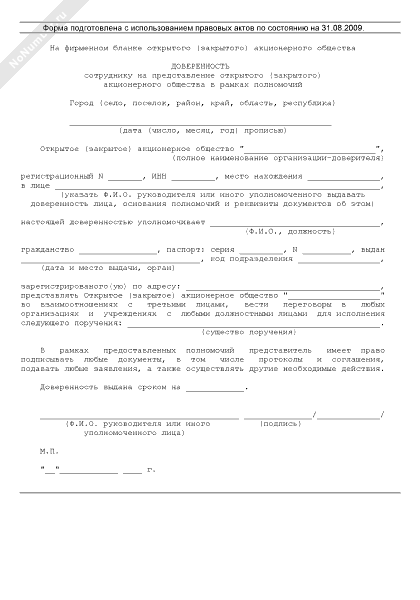 - 230Доверенность сотруднику на представление открытого (закрытого) акционерного общества в рамках полномочий