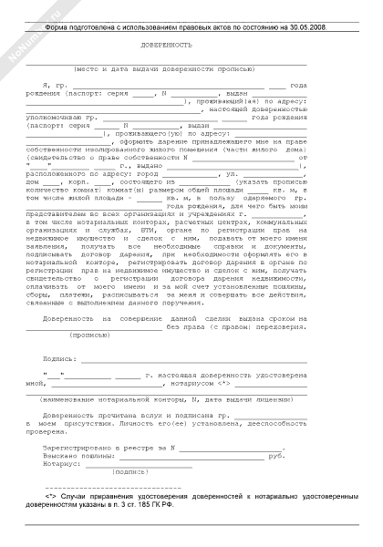 Доверенность на оформление дарения изолированного жилого помещения (части жилого дома), нотариальное заверение и регистрацию договора дарения