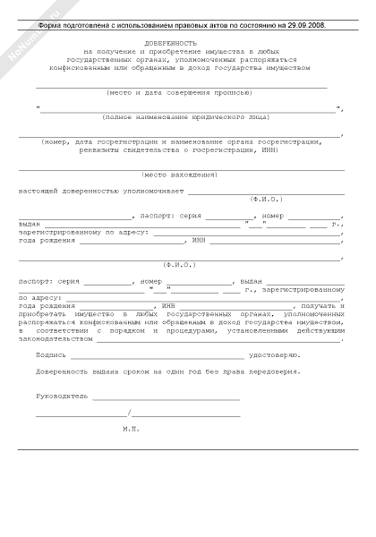 Доверенность на получение и приобретение имущества в любых государственных органах, уполномоченных распоряжаться конфискованным или обращенным в доход государства имуществом (рекомендуемый образец заполнения)