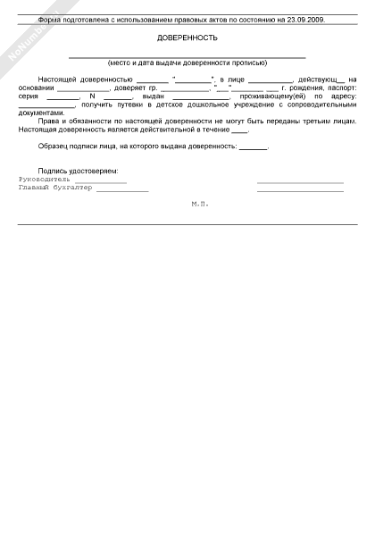 Доверенность на получение путевок в детское оздоровительное учреждение