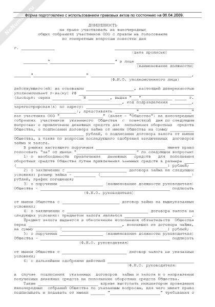 Доверенность на право участвовать на внеочередных общих собраниях Общества с ограниченной ответственностью с правом на голосование по конкретным вопросам повестки дня (рекомендуемый образец заполнения)
