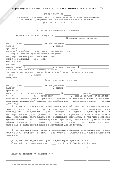 Доверенность на право управления транспортным средством с правом продажи от имени гражданина Российской Федерации — владельца транспортного средства (рекомендуемый образец заполнения)