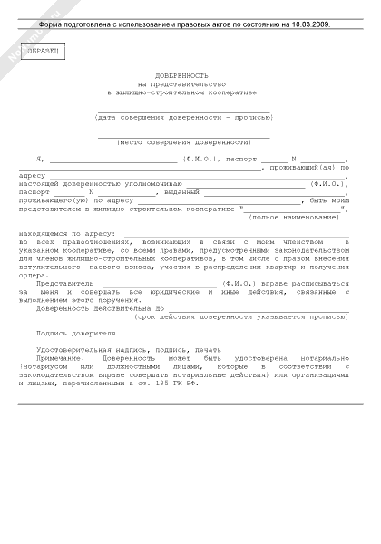 Доверенность на представительство в жилищно-строительном кооперативе (рекомендуемый образец заполнения)
