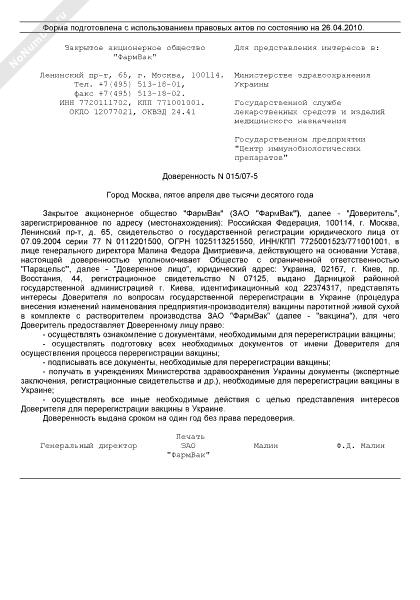 Доверенность на представление интересов по вопросам государственной перерегистрации вакцины (рекомендуемый образец заполнения)