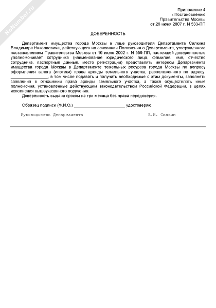 Доверенность на представление интересов Департамента имущества города Москвы в Департаменте земельных ресурсов города Москвы (рекомендуемый образец заполнения)