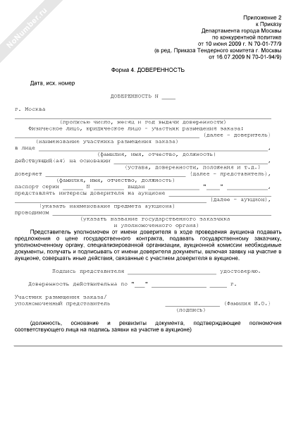 Доверенность на представление интересов доверителя на аукционе на право заключения государственного контракта на поставки товаров, выполнение работ, оказание услуг для государственных нужд города Москвы (форма № 4)
