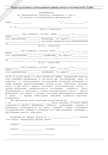 Доверенность на представление интересов гражданина в суде и на участие в исполнительном производстве (рекомендуемый образец заполнения)