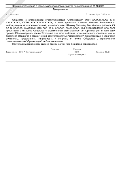 Доверенность на представление интересов организации в налоговых органах РФ и совершение всех необходимых для этого действий (рекомендуемый образец заполнения)