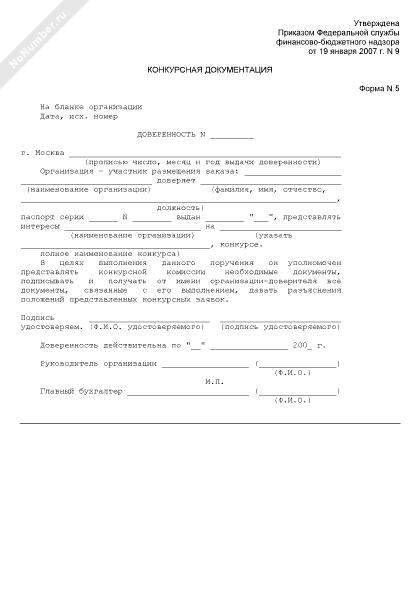 Доверенность на представление интересов организации в открытом конкурсе на право заключить государственный контракт на разработку и внедрение механизмов эффективного взаимодействия Федеральной службы финансово-бюджетного надзора и общества (форма № 5)
