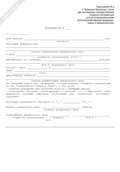 Доверенность на представление интересов в Биржевых торгах и подписание договора при проведении государственных товарных интервенций для регулирования рынка сельскохозяйственной продукции, сырья и продовольствия на ЗАО «Национальная товарная биржа» (рекомендуемый образец заполнения)