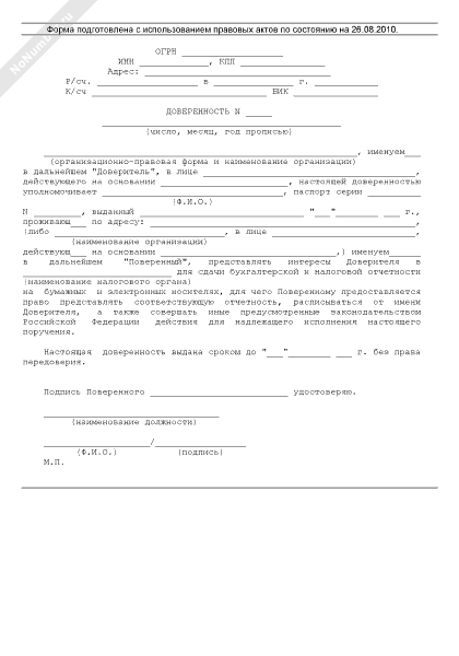 Доверенность на представление организации при сдаче бухгалтерской и налоговой отчетности (рекомендуемый образец заполнения)