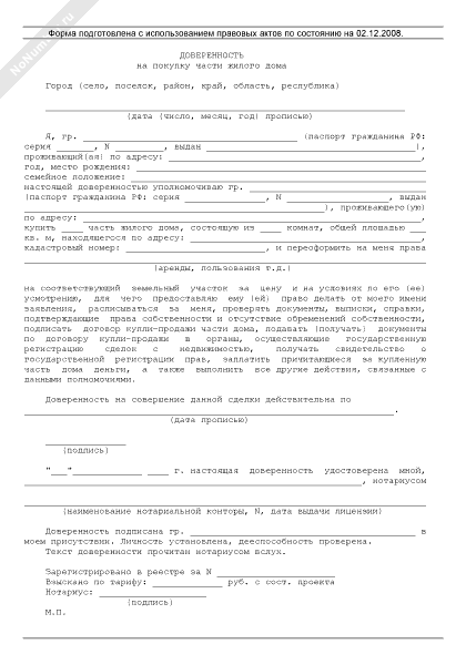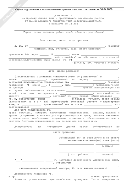 Доверенность на продажу жилого дома от имени законного представителя (несовершеннолетнего до 14)