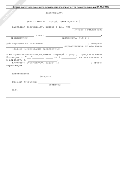 Доверенность на производство транспортно-экспедиционных операций (рекомендуемый образец заполнения)