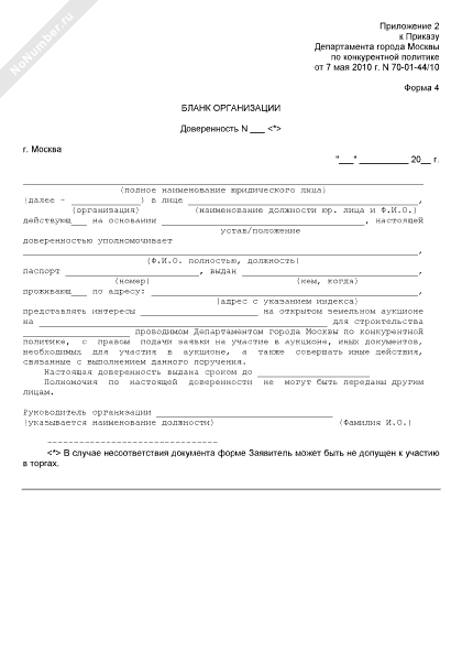 Доверенность на сдачу заявки и других необходимых документов для участия в открытом земельном аукционе (форма № 4)