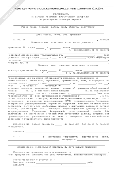 Доверенность на совершение дарения квартиры представителем, а также на нотариальное заверение и регистрацию договора дарения (рекомендуемый образец заполнения)