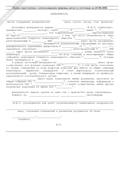 Доверенность на участие в общем собрании акционеров открытого акционерного общества представителя доверительного управляющего (рекомендуемый образец заполнения)