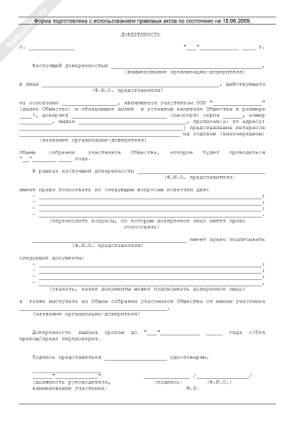 Доверенность на участие в общем собрании участников общества с ограниченной ответственностью (с ограничением полномочий)