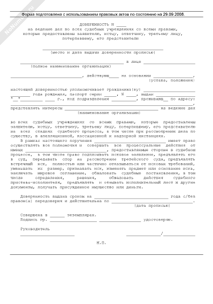Доверенность на ведение дел во всех судебных учреждениях со всеми правами, которые предоставлены заявителю, истцу, ответчику, третьему лицу, потерпевшему, его представителю (рекомендуемый образец заполнения)