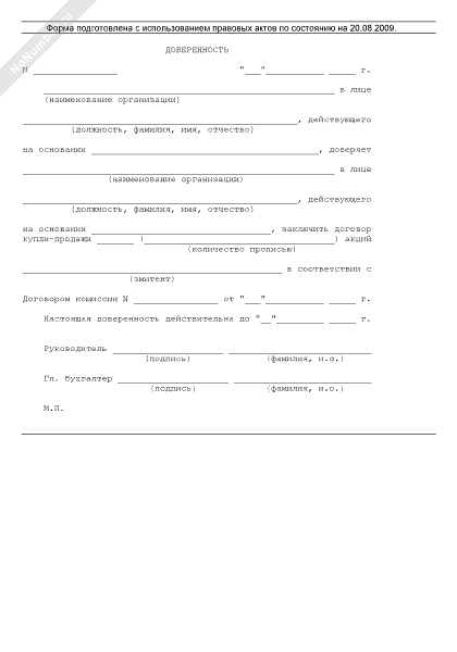 Доверенность на заключение договора купли-продажи ценных бумаг (рекомендуемый образец заполнения)