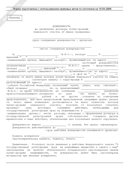 Доверенность на заключение договора купли-продажи земельного участка от имени гражданина (рекомендуемый образец заполнения)