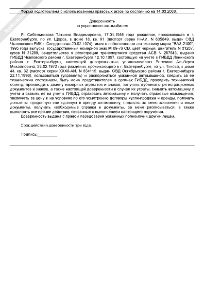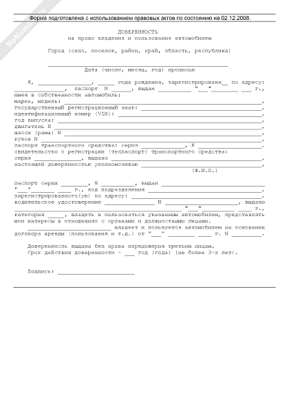 Доверенность на право владения автомобилем