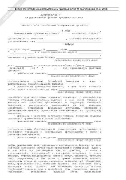 Доверенность на руководителя филиала организации