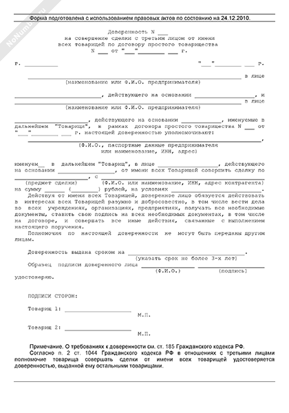 Доверенность на совершение сделки от имени всех товарищей