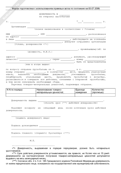 Доверенность сотруднику организации на отправку грузобагажа