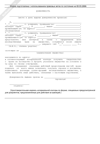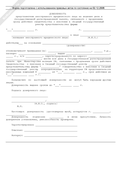 Доверенность представителю иностранного юридического лица на ведение дела в государственной регистрационной палате, связанного с продлением срока действия свидетельства о внесении в сводный государственный реестр представительства фирмы (рекомендуемый образец заполнения)