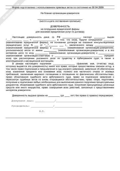 Доверенность юридического лица на сотрудника юридической фирмы для оказания юридических услуг по договору (рекомендуемый образец заполнения)
