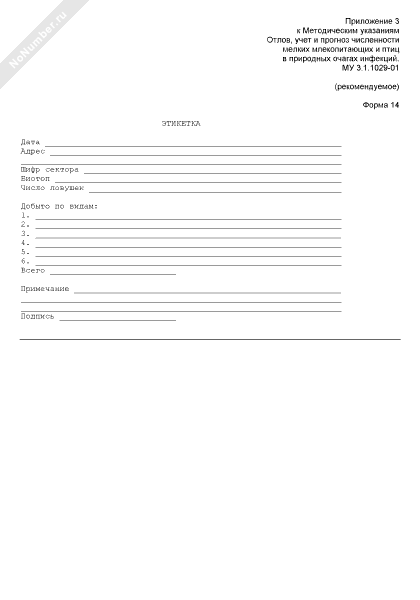 Этикетка к собранным материалам для лабораторных исследований. Форма № 14