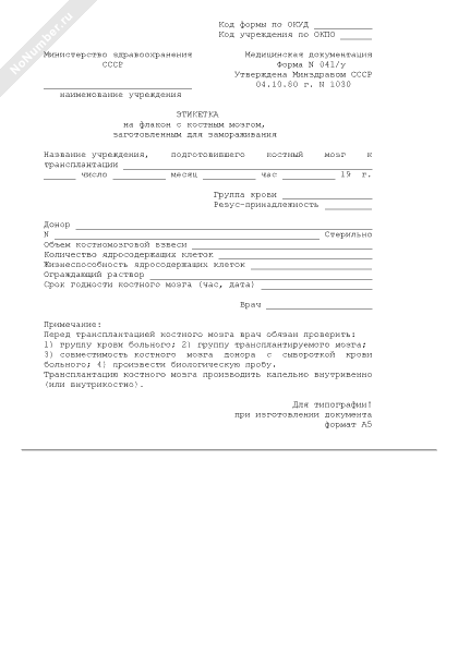 Этикетка на флакон с костным мозгом, заготовленным для замораживания. Форма № 041/у