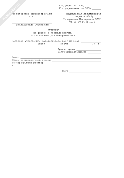 Этикетка на флакон с костным мозгом, заготовленным для замораживания. Форма № 034/у