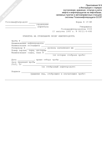 Этикетка на отобранную пробу нефтепродукта. Форма № 19-НП
