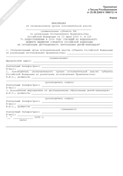 - 2015Форма информации об уполномоченном органе исполнительной власти субъекта РФ по реализации Постановления Правительства Российской Федерации от 23 июня 2009 г. № 525 «О предоставлении в 2009 году субсидий из федерального бюджета бюджетам субъектов РФ на организацию дистанционного образования детей-инвалидов»